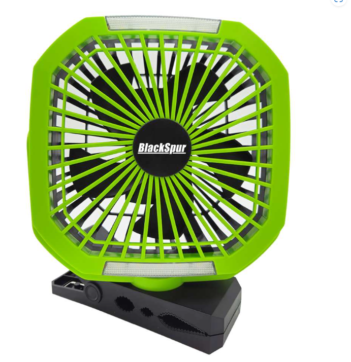 Daul Function fan with led work light. Led light is 400 lumens Rechargeable. Easy clip-on clamp to be able to mount in any location.